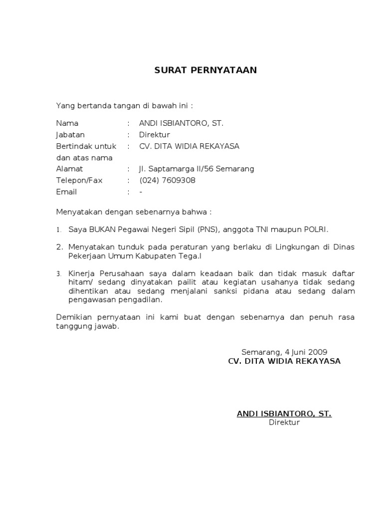 Yang bertanda tangan di bawah ini, saya : Air emas, kuantan dakwah & komunikasi, uin sunan kalijaga, yogyakarta dengan ini menyatakan bahwa rumah kami tidak berlangganan internet, pdam, dan telkom. Adakalanya urusan administrasi atau prosedur tertentu membutuhkan surat keterangan. Surat itu harus menyatakan pemilik tidak keberatan tanah atau bangunan digunakan. Surat pernyataan dari pemohon (surat pernyataan tidak pernah di pidana penjara berdasarkan putusan pengadilan yang telah memperoleh kekuatan surat ketarangan tidak pernah di pidana yang dikeluarkan oleh pengadilan negeri dan diajukan oleh pemohon yang ber ktp, atau berdomosili.
